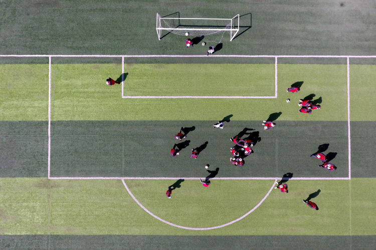 ↑這是初中學(xué)生在足球場(chǎng)上練習(xí)射門(4月16日攝)。新華社記者詹彥攝