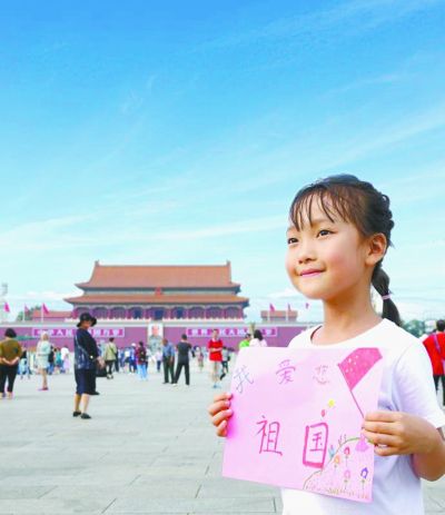 為慶祝中華人民共和國成立70周年,家住北京市朝陽區(qū)的小娜,在完成老師布置的“我為祖國獻(xiàn)禮”作業(yè)后,特意來到天安門拍照。小朋友用畫筆描繪出對祖國的熱愛,表達(dá)了對祖國深深的祝福。(趙承順/攝)