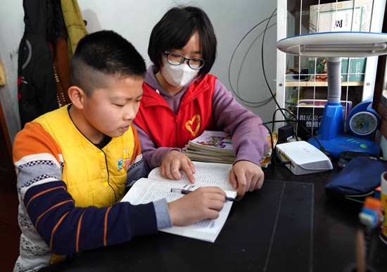 疫情之下,停課不停學(xué)。家住安徽省合肥市廬江縣廬城鎮(zhèn)繡溪社區(qū)陽光花園小區(qū)的錢自豪是一名初一學(xué)生,他家迎來了一位“臨時”老師,是來自安徽農(nóng)業(yè)大學(xué)2017級的大學(xué)生志愿者朱婧(右)。周躍東/攝