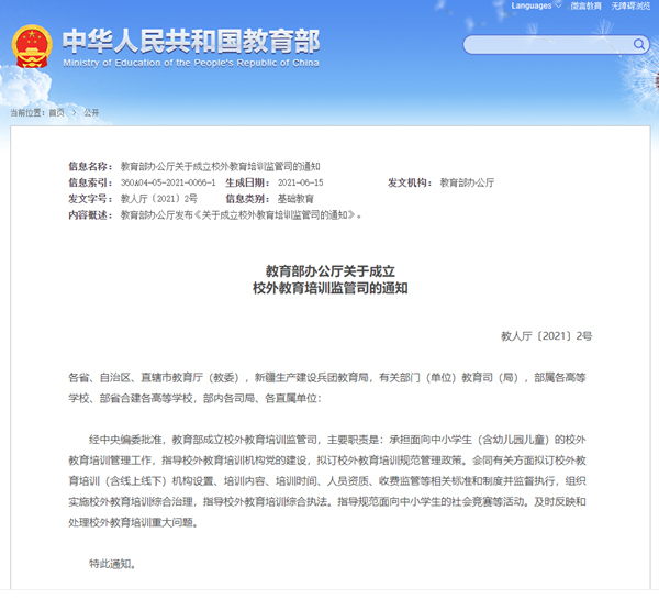 人民網(wǎng)北京6月15日電 (記者孫競)今天,教育部宣布成立校外教育培訓(xùn)監(jiān)管司。
