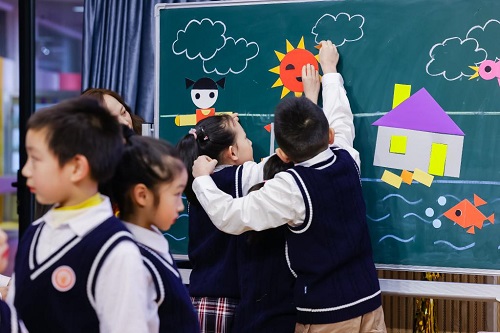 舞臺上,孩子們進行著奇妙的“圖形之旅”——“分一分”,分出立體與平面圖形;“拼一拼”,拼出想象中的樂園;“說一說”,說出自己的創(chuàng)意設(shè)想……這是上海市黃浦區(qū)北京東路小學(xué)近日舉行的一年級“期末考試”。