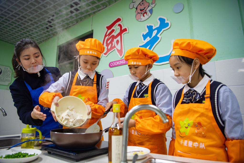 “這道麻婆豆腐色香味俱全!”“我覺得宮保雞丁更好吃……”學(xué)期末,重慶市沙坪壩區(qū)濱江小學(xué)的廚藝課迎來結(jié)課“廚藝秀”。同學(xué)們走進廚藝工作室,起鍋、下菜、擺盤,爭相展示一學(xué)期下來的“學(xué)習(xí)成果”。