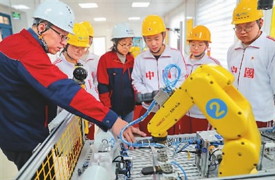 河北建材職業(yè)技術學院教師指導學生進行工業(yè)機器人操作與運維1+X職業(yè)等級證書的實操訓練。(曹建雄攝 人民視覺)