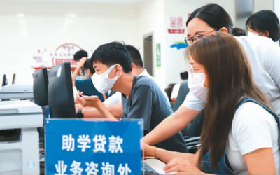 今年8月9日,在貴州省黔西市人民政府政務(wù)服務(wù)中心,志愿者在為大學(xué)生辦理信用助學(xué)貸款。新華社發(fā)