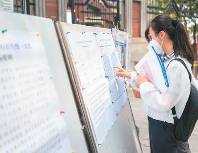 二○二二年七月七日,二○二二年上海市普通高等學(xué)校招生統(tǒng)一文化考試開考,五萬多名考生奔赴考場。圖為上海格致中學(xué)考點,考生查看考場信息。 王 初攝(人民視覺)