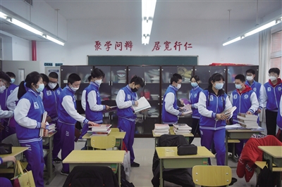 2月12日,北京市第十八中學(xué),學(xué)生排隊(duì)領(lǐng)取新學(xué)期教材。新京報(bào)記者 李木易 攝