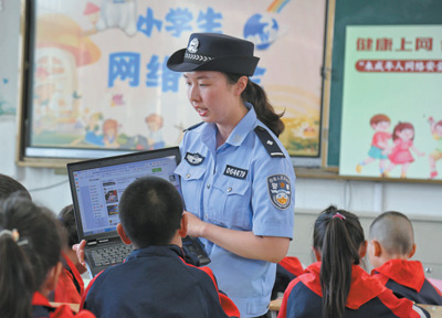 江蘇省海安市公安局墩頭派出所民警在學(xué)校引導(dǎo)學(xué)生安全上網(wǎng)、文明上網(wǎng)。周 強(qiáng)攝(人民視覺)