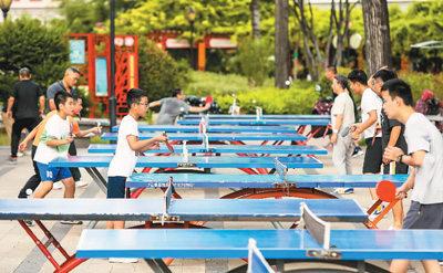 8月8日,在山東省滕州市弘道公園內,市民正在打乒乓球。宋海存攝(人民視覺)