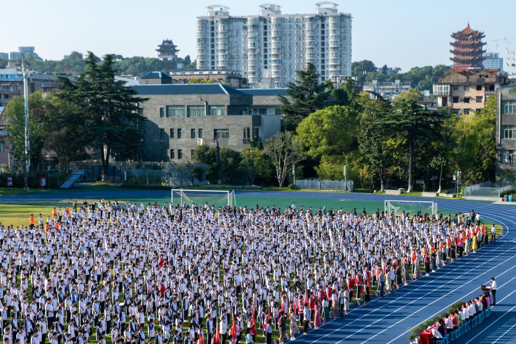 湖北省武昌實(shí)驗(yàn)中學(xué)師生在參加開(kāi)學(xué)典禮。(杜子璇 攝)