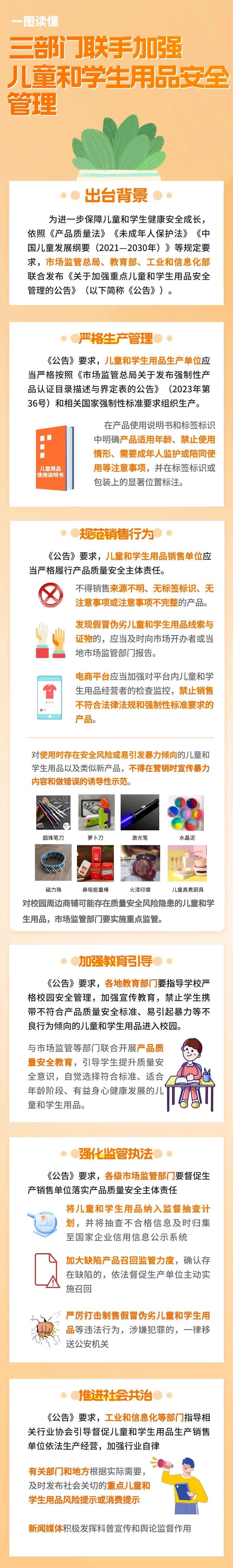 近日 市場(chǎng)監(jiān)管總局、教育部和 工業(yè)和信息化部 就加強(qiáng)重點(diǎn)兒童和學(xué)生用品 安全管理有關(guān)事項(xiàng)發(fā)布公告 禁止學(xué)生攜帶 不符合產(chǎn)品質(zhì)量安全標(biāo)準(zhǔn) 易引起暴力等不良行為傾向的 兒童和學(xué)生用品進(jìn)入校園