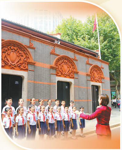 中共一大會(huì)址,上海市的小學(xué)生在老師指揮下齊唱《沒(méi)有共產(chǎn)黨就沒(méi)有新中國(guó)》。陳亞?wèn)|攝