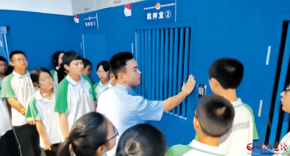 法院干警向?qū)W生們展示警用器械,詳細(xì)介紹了八件套、電子腳銬、束縛帶、盾牌等常用器械的使用方法和適用場(chǎng)合。大家聽(tīng)完后,顯示出濃厚興趣,躍躍欲試,在法警叔叔的指導(dǎo)下,體驗(yàn)了各類(lèi)警用器械。之后,學(xué)生們還參觀了羈押室。