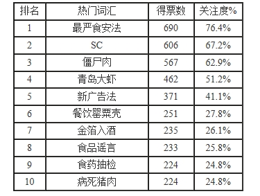據(jù)悉,本次活動(dòng)首先由食品伙伴網(wǎng)的“食品論壇”板塊網(wǎng)友針對(duì)2015年的熱門事件概括成一個(gè)關(guān)鍵詞,之后經(jīng)過整理篩選出20個(gè)候選詞匯,并于2016年1月21日-2月17日在食品論壇投票。期間共有 902位經(jīng)過審核認(rèn)證的注冊(cè)網(wǎng)友參與投票,最終選出十大熱門詞匯。