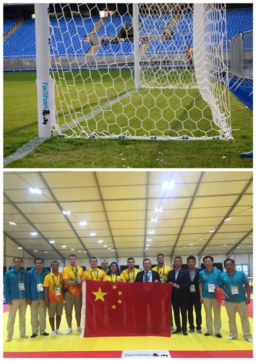 (圖為里約奧運(yùn)會(huì)上泰山體育提供的足球比賽設(shè)施和摔跤墊,泰山體育提供)