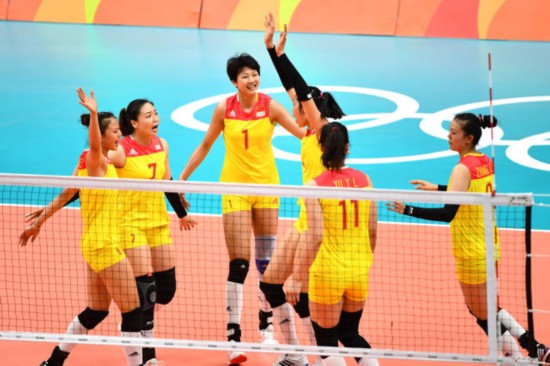 (圖為里約奧運(yùn)會(huì)女排小組賽中,中國(guó)隊(duì)球員在與波多黎各隊(duì)比賽中慶祝得分。新華社圖片)
