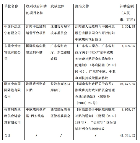 其中,中國(guó)外運(yùn)在2019年7月-9月期間獲得的超過(guò)500萬(wàn)元人民幣的大額政府補(bǔ)貼項(xiàng)目有:沈陽(yáng)中歐班列運(yùn)營(yíng)平臺(tái)項(xiàng)目獲得補(bǔ)助金額3304.35萬(wàn)元、國(guó)際鐵路集裝箱班列補(bǔ)貼獲得補(bǔ)助金額4499.95萬(wàn)元、湘歐班列財(cái)政補(bǔ)貼獲得補(bǔ)助金額2.46億元、中歐班列俄羅斯-西安線路獲得補(bǔ)助金額8959.67萬(wàn)元。