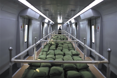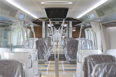 目前列車設(shè)計載客量為每平方米9人,列車最大載客量為1500人左右。為保證舒適度,車廂設(shè)計得更加寬敞明亮。車廂設(shè)計寬3.3米,普通車設(shè)置雙排座椅,商務(wù)車設(shè)置2+1座椅,為方便乘客放置隨身攜帶的行李,加寬了座椅前后的距離,普通列車座椅前后寬度1.03米,商務(wù)車廂有1.25米。