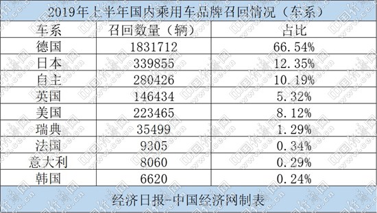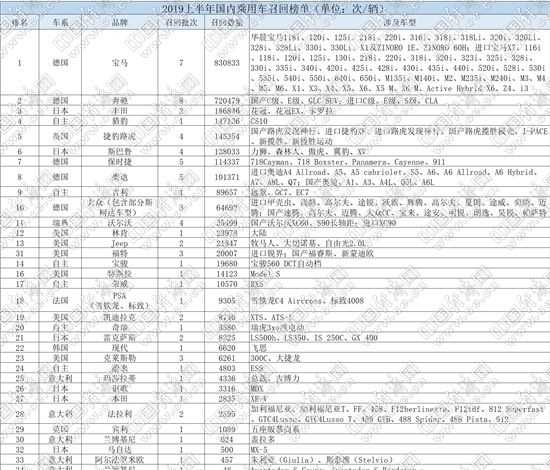 分車系來看,上半年,德系品牌成為召回“主力”,1-6月,德系品牌共召回汽車1831712輛,占召回總量的66.54%,其中寶馬、奔馳分別以830833輛和720479輛的召回?cái)?shù)量,“遙遙領(lǐng)先”其他品牌;而高檔車、超級(jí)跑車品牌保時(shí)捷更是召回汽車114337輛,數(shù)量甚至遠(yuǎn)超其2018年80108輛的銷量總和。