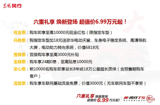 除此之外,為讓新風行T5的用戶能夠享受踏實無憂的購車、用車生活,東風風行貼心準備六重“禮享”,包括現(xiàn)金惠、升艙惠、置換惠、金融惠、安心惠、流量惠等,力度十足。