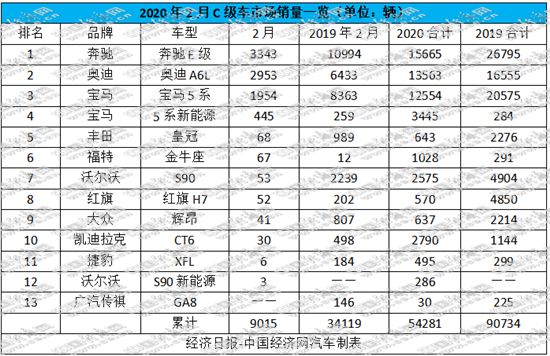 2月,幾乎全部國產(chǎn)C級車的銷量都出現(xiàn)暴跌,有的甚至沒有出現(xiàn)在行業(yè)的銷量統(tǒng)計表上。據(jù)統(tǒng)計,共有來自10個品牌的12款車型公布了銷量數(shù)據(jù):2月,國產(chǎn)C級車的累計銷量為9015輛,環(huán)比下滑80.08%,與去年同期相比下降73.58%;今年前2個月的累計銷量為54281輛,同比下滑40.18%。 在此背景下,以奔馳、寶馬和奧迪為代表的“德系三強”,在C級車市場的業(yè)績也受到非常嚴重的沖擊。不過,奔馳E級、奧迪A6L和寶馬5系的銷量之和達8250輛,市場份額為91.51%;如果再加上寶馬5系新能源車型,“德系三強”在C級車市場的份額則高達96.45%。