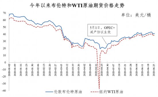 其中,4月20日紐約WTI原油5月合約臨近交割前甚至跌至每桶-37.63美元的負值。極低油價給沙特、俄羅斯等主要產(chǎn)油國帶來沉重壓力,并促使各方達成新一輪歷史性最大力度減產(chǎn)協(xié)議。隨著5月OPEC+正式推進減產(chǎn),美國等產(chǎn)油國在低油價下產(chǎn)量也出現(xiàn)下降,以及更多海外國家放寬疫情管制,需求預期得到改善,國際油價逐步回升。目前,倫敦布倫特和紐約WTI油價升至每桶41美元和39美元的水平。