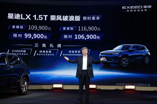 奇瑞汽車股份有限公司黨委書記、董事長尹同躍現(xiàn)場宣布了一項“長期福利”:即日起至10月31日,星途LX 1.5T乘風(fēng)破浪版限時售價9.99萬元起、還可享CN95空濾免費升級、首任車主基礎(chǔ)流量終身免費、首任車主發(fā)動機及變速箱核心零部件終身質(zhì)?!叭舛Y包”。