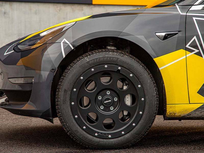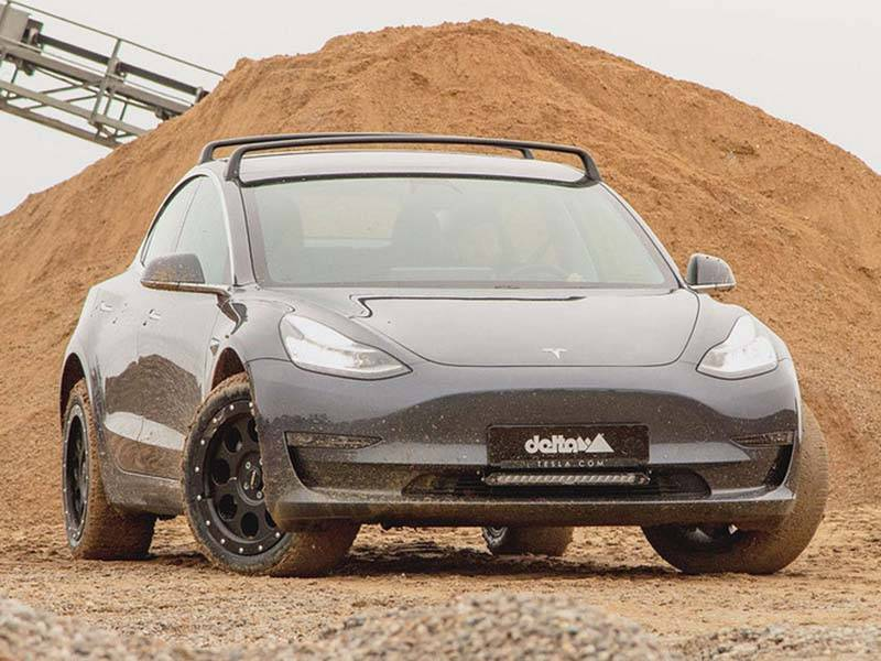 細(xì)節(jié)來(lái)看,該車(chē)由德國(guó)Delta 4×4公司打造,新車(chē)分別在四個(gè)尺寸為18×8.5的定制車(chē)輪上安裝了35毫米的舉升套件,使得Model 3具有40 mm的額外離地間隙。此外,全黑輪轂以及加裝的行李架都使Model 3顯得更加硬派。