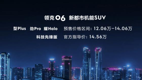 2020年7月24日,領克06于成都車展公布了型Plus、勁Pro、耀Halo三款車型的預售價格,區(qū)間為12.06-14.06萬,并于7月24日下午16:06于領克商城開啟線上預訂。同時,首發(fā)600臺科技先鋒版,價格為14.56萬,將于8月6日16:06在領克商城開啟搶訂。