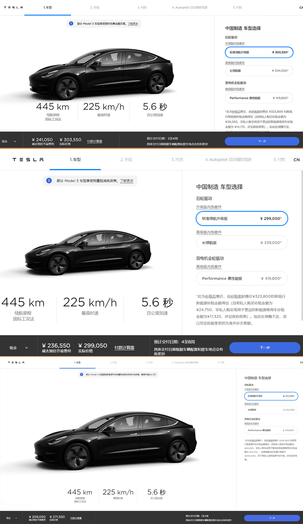 特斯拉Model 3標準續(xù)航后驅(qū)升級版價格多次調(diào)整官網(wǎng)截圖。