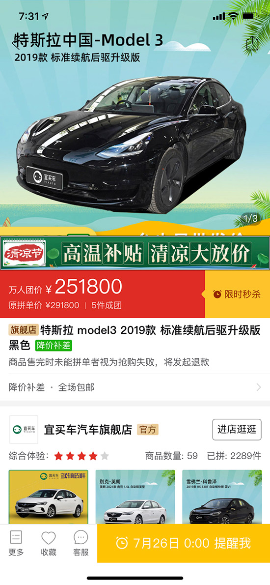 今年7月21日,連鎖汽車銷售平臺宜買車聯(lián)合拼多多推出了一場特斯拉萬人團購活動?;顒悠陂g,特斯拉官方指導(dǎo)價為27.155萬元的特斯拉Model 3 標準續(xù)航后輪驅(qū)動升級版 ,在拼多多平臺上的團購價為每臺25.18萬元,團購價格比官方售價便宜了近2萬元。