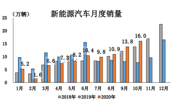 10月,新能源汽車產(chǎn)銷分別完成16.7萬輛和16萬輛,同比分別增長69.7%和104.5%,其單月產(chǎn)銷第四次刷新了當(dāng)月歷史記錄。從細分能源類型來看,其中純電動汽車產(chǎn)銷分別完成14.1萬輛和13.3萬輛,同比分別增長72.4%和115.4%;插電式混合動力汽車產(chǎn)銷分別完成2.6萬輛和2.7萬輛,同比分別增長56.7%和63.7%;燃料電池汽車產(chǎn)銷分別完成77輛和79輛,同比分別增長1.3%和4.0%。