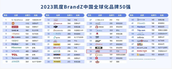6月中旬,全球知名品牌排行榜凱度BrandZ攜手谷歌發(fā)布了《2023凱度BrandZ中國全球化品牌50強(qiáng)》榜單,江淮汽車位列中國全球化品牌第36位,相較2022年上升了4個名次,這是江淮汽車連續(xù)三年榮登該榜單,展現(xiàn)了持續(xù)、強(qiáng)勁的品牌增長勢頭。