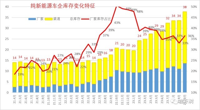 從僅生產(chǎn)新能源車的企業(yè)的庫存變化特征分析看,2023年年初庫存20萬,年初的庫存保持較好,總體新能源庫存在2月后開始持續(xù)地上升,目前上升到10月末的38萬臺(tái)水平。近期主要增長的是經(jīng)銷商庫存,這也是經(jīng)銷模式為主流進(jìn)行新能源銷售的結(jié)果。