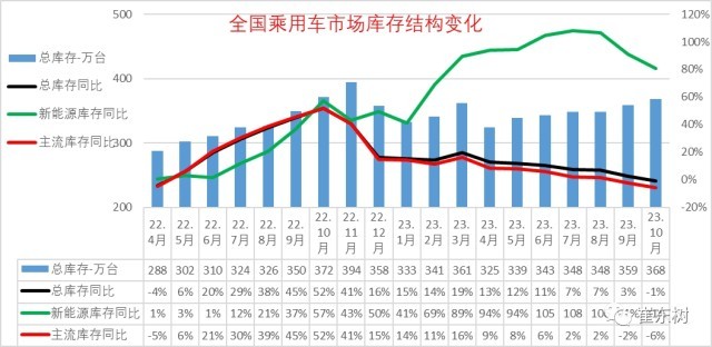 2023年10月的全國主流燃油乘用車行業(yè)庫存同比下降6%,因此判斷目前總體主流燃油乘用車行業(yè)處于去庫存周期。由于2022年10月是車購稅優(yōu)惠政策的結(jié)束前期,因此廠家急迫大量生產(chǎn)燃油車,導(dǎo)致庫存暴增,而市場被封了,因此高庫存帶來較長時(shí)間的痛苦去庫存,并帶來2023年3月的降價(jià)潮。近幾個(gè)月的燃油車市場總體處于萎縮的趨勢(shì),因此被動(dòng)去庫存的慘烈程度是很嚴(yán)重的,無論廠家還是經(jīng)銷商的日子都不好過。