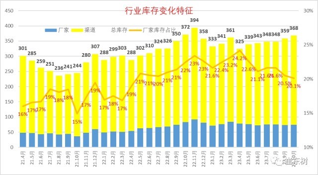 根據(jù)乘聯(lián)會(huì)的數(shù)據(jù),2023年10月月末全國乘用車庫存368萬臺(tái),其中廠家?guī)齑?4萬臺(tái),渠道庫存294萬臺(tái),廠家?guī)齑嬲急?0.1%,較2022年10月下降1.9個(gè)百分點(diǎn),環(huán)比上月下降0.4個(gè)百分點(diǎn)。