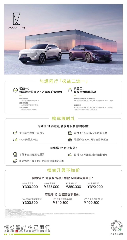 權(quán)益一,1月8日后購車的用戶贈送限時價值26,000元高階智駕包,以不依賴高精地圖的NCA帶來全域都領(lǐng)先的高速城區(qū)泊車全覆蓋體驗(yàn)。權(quán)益二,活動期間購車用戶可享5倍定金膨脹禮遇,5000定金抵扣25,000元車款,車價立減兩萬元。與此同時,阿維塔推出更多貼心限時權(quán)益:首任車主終身三電質(zhì)保,6000元置換補(bǔ)貼即刻擁有;另外,全系車主可享智能香氛系統(tǒng)贈送,并擁有首付4.2萬元起、全期限超低息的購車金融權(quán)益。與此同時,阿維塔 11 鴻蒙版智享升級款全國零售價30萬- 39萬元,真正做到產(chǎn)品升級不加價。