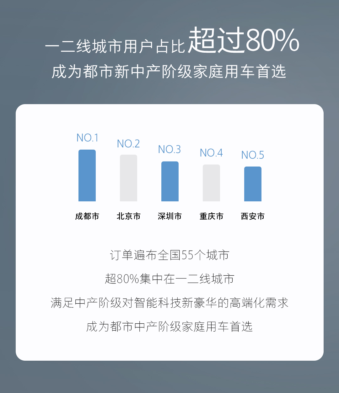 全新藍(lán)山的訂單已覆蓋全國55個城市,主要集中在成都、北京、深圳、重慶、西安等一二線城市,不僅彰顯了這些都市精英人群對高端智能出行方式的追求,更體現(xiàn)了其對智能駕駛和奢華配置的高要求。