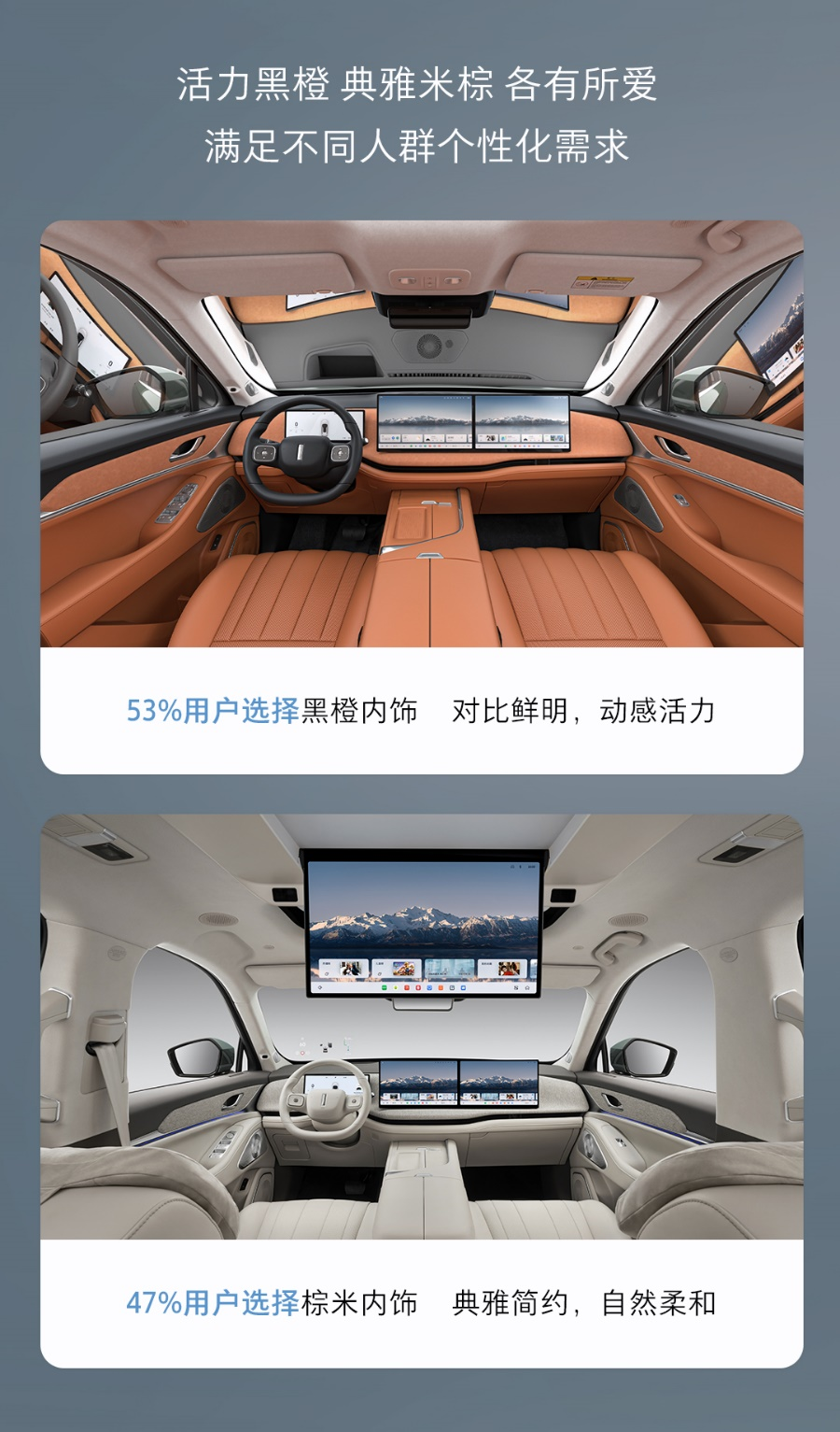 在內(nèi)飾方面,黑橙搭配占比53%,既保留了黑色的神秘感,又融入了橙色的活力元素,整體風(fēng)格不失優(yōu)雅大氣,又充滿動感與生機(jī),彰顯出對比鮮明、溫暖陽光的空間氛圍;棕米內(nèi)飾則以47%的占比,為車艙營造一抹精致與高雅,高級質(zhì)感,一眼望去平和寧靜,營造出自然柔和的家庭氛圍,同樣符合更多用戶的審美需求。