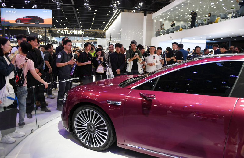 (資料圖片)4月25日,在北京中國國際展覽中心順義館舉行的2024北京車展上,參觀者觀看車展上發(fā)布的新款車型。新華社記者 鞠煥宗 攝
