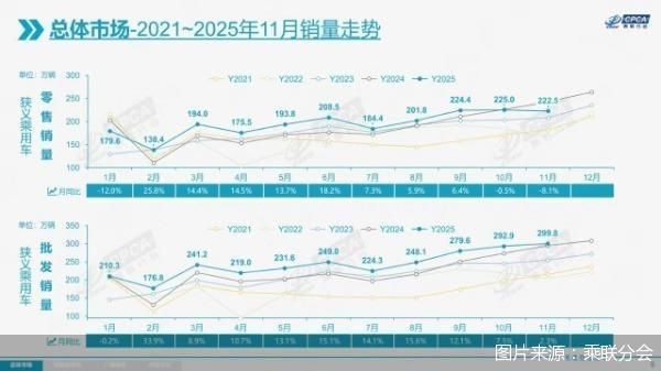 車市正進入平穩(wěn)發(fā)展階段。12月8日,中國汽車流通協(xié)會乘用車市場信息聯(lián)席分會(以下簡稱“乘聯(lián)分會”)發(fā)布的數(shù)據(jù)顯示,2025年前11個月零售2148.3萬輛,整體保持增長。不過,今年11月車市零售量同比、環(huán)比均出現(xiàn)下滑。“11月乘用車市場銷量環(huán)比出現(xiàn)下降,是比較少見的?!背寺?lián)分會秘書長崔東樹認為,今年上半年,我國乘用車市場銷量實現(xiàn)較快增長,下半年車市增長需回到合理、穩(wěn)定的狀態(tài)。車市進入平穩(wěn)期有利于市場長期穩(wěn)定發(fā)展,預計今年零售將增長5%。