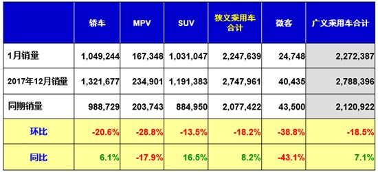 乘聯(lián)會數(shù)據(jù)顯示,1月SUV共銷售1031047輛,同比增長16.5%,環(huán)比下降13.5%。崔東樹認為,1月SUV有如此增速,說明其處于良好的發(fā)展?fàn)顟B(tài),這說明在去年12月到今年1月小排量購置稅政策變化的過程中,SUV所受影響較小。