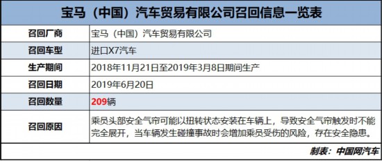 6月20日下午,國家市場監(jiān)督管理總局發(fā)布消息,寶馬(中國)汽車貿(mào)易有限公司根據(jù)《缺陷汽車產(chǎn)品召回管理條例》和《缺陷汽車產(chǎn)品召回管理條例實施辦法》的要求,決定自即日起,召回2018年11月21日至2019年3月8日期間生產(chǎn)的部分進(jìn)口X7汽車,共計209輛。