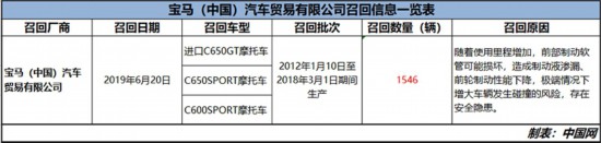 同時,寶馬(中國)汽車貿(mào)易有限公司自即日起召回2012年1月10日至2018年3月1日期間生產(chǎn)的進(jìn)口C650GT、C650SPORT、C600SPORT摩托車,共計1546輛。