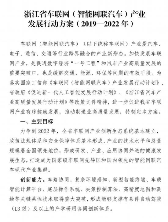 推動智能網(wǎng)聯(lián)發(fā)展的,除了技術(shù),還有政策?!凹涌彀l(fā)展智能網(wǎng)聯(lián)產(chǎn)業(yè),是促進數(shù)字經(jīng)濟‘一號工程’和汽車產(chǎn)業(yè)高質(zhì)量發(fā)展的重要突破口,也是緩解交通、能源、環(huán)保等問題的有效手段?!苯?,浙江省經(jīng)濟和信息化廳、科技廳、交通運輸廳聯(lián)合印發(fā)《浙江省車聯(lián)網(wǎng)(智能網(wǎng)聯(lián)汽車)產(chǎn)業(yè)發(fā)展行動方案(2019-2022 年)》(以下簡稱《方案》)中所指出的,正是發(fā)展智能網(wǎng)聯(lián)的意義所在。