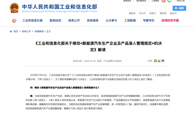 據(jù)悉,《工業(yè)和信息化部關(guān)于修改〈新能源汽車生產(chǎn)企業(yè)及產(chǎn)品準(zhǔn)入管理規(guī)定〉的決定》已經(jīng)在2020年7月14日工業(yè)和信息化部第16次部務(wù)會(huì)議審議通過(guò),現(xiàn)予公布,自2020年9月1日起施行。