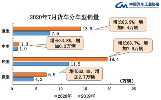 在貨車方面,7月,貨車產(chǎn)銷分別為43.8萬輛和41.5萬輛,環(huán)比下降10.1%和16.0%,同比增長(zhǎng)86.3%和71.1%;1-7月,貨車產(chǎn)銷分別完成261.1萬輛和261.5萬輛,同比分別增長(zhǎng)19.6%和17.4%。