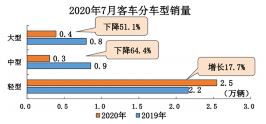 從細(xì)分車型來看,7月,大型客車銷0.4萬輛,環(huán)比下降37.7%,同比下降51.1%;1-7月,大型客車銷2.7萬輛,同比下降33.8%。中型客車銷0.3萬輛,環(huán)比下降27.0%,同比下降64.4%;1-7月,中型客車銷2.0萬輛,同比下降44.3%。輕型客車銷2.5萬輛,環(huán)比下降21.9%,同比增長(zhǎng)17.7%;1-7月,輕型客車銷17.0萬輛,同比下降1.7%。