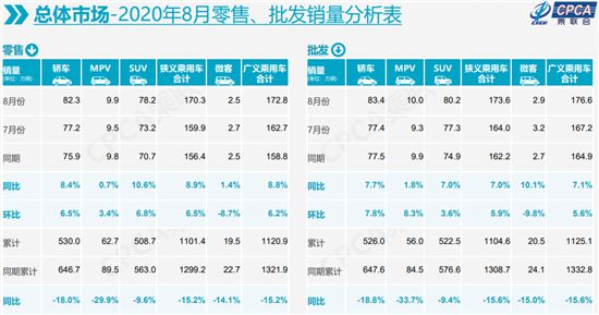 分車型來看,8月三大乘用車市場同環(huán)比均呈增長態(tài)勢。其中MPV市場銷量為9.9萬輛,同比增長0.7%,環(huán)比增長3.4%;轎車和SUV市場8月銷量分別為82.3萬輛和78.2萬輛,同比增幅分別為8.4%和10.6%,環(huán)比增幅分別為6.5%和6.8%。1-8月,轎車、SUV、MPV三大市場累計銷量分別為530.0萬輛、508.7萬輛和62.7萬輛,同比分別下降18.0%、9.6%和29.9%。
