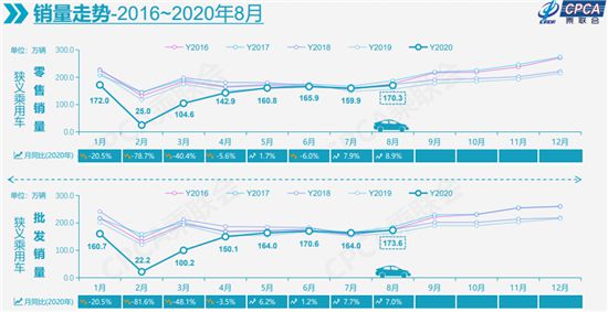 昨日(9月8日),乘用車市場信息聯(lián)席會發(fā)布數據顯示,8月,國內狹義乘用車銷量達到170.3萬輛,同比增長8.9%,實現了自2018年5月以來的最強正增長。今年1-8月的零售累計增速下滑15.2%,較1-7月累計增速提升3.3個百分點,體現出行業(yè)的快速回暖態(tài)勢。