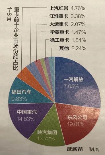 具體來看,8月,一汽解放和東風(fēng)公司的銷量均超過2.7萬輛,其中,一汽解放銷售重卡2.76萬輛,同比增長74%,繼續(xù)位列行業(yè)第一;1~8月,一汽解放累計(jì)銷量29.31萬輛,同比增長41%,市場占有率從去年同期的25.7%提升至今年的27%。緊隨其后的東風(fēng)公司8月以2.7萬輛、同比增長64%的成績,位列行業(yè)第二;1~8月,東風(fēng)公司累計(jì)銷量20.6萬輛,同比增長29%,市場占有率快速提升,已接近去年同期水平,達(dá)到19%。